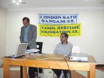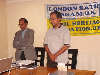 Mr Pradeep Chakravarthy of Leadership Institute at Infosys,Chennai addressed an elite audience in London on 9th August 2011 . He is seen with the president of London Sath Sangam Mr Balaji. Mr S Swaminathan, Secretary of London Sath Sangam and Tamil Heritage Foundation, UK welcomed the gathering. Chakravarthy’s talk on the Saraswathy Mahal Library of Thanjavur was very interesting and informative.