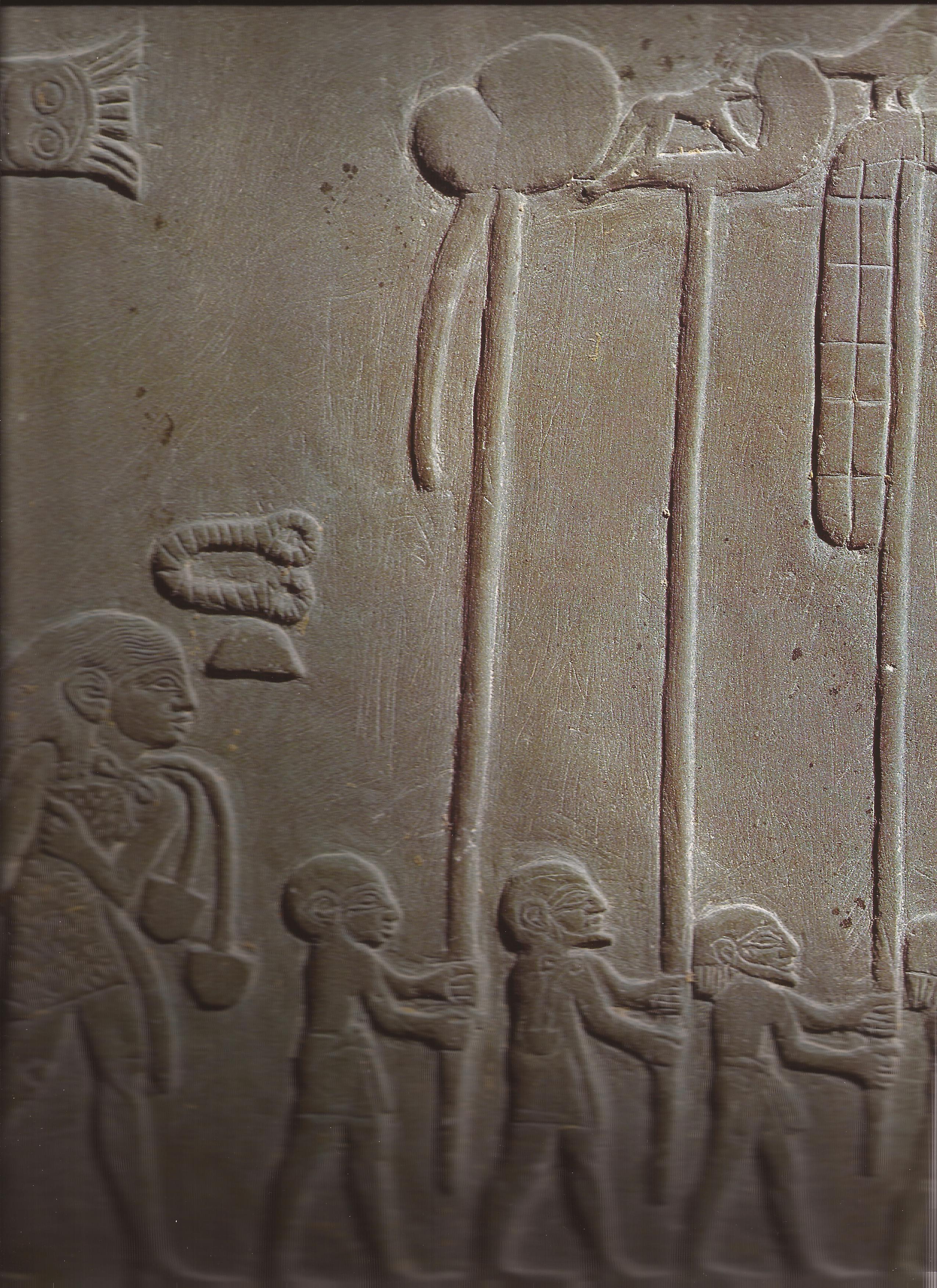 எகிப்தில் நரமேர் (நர மேரு) என்பவருடைய சின்னத்தில் இப்படி ஒரு காட்சி இருக்கிறது. அதில் நான்கு பேர் உயர்ந்த கொடிக் கம்பில் நான்கு உருவங்களைத் தூக்கிச் செல்கின்றனர். முதல் இருவர் இரண்டு பறவைகள் உடைய கம்பத்தைத் தூக்கிக் கொண்டிருக்கின்றனர். அதிலிருந்து தோரணம் போல ஏதோ தொங்குகிறது. மூன்றாமவர் ஓநாய் வடிவ தெய்வத்தைத் தூக்கிச் செல்கிறார். நாலாமவர் ஏதோ ஒரு மூட்டை மாதிரி ஒன்றத் தூக்கிச் செல்கிறார்.