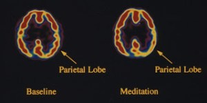 சிங்கிள் போடான் எமிஷன் கம்ப்யூடட் டோமோகிராபி (SPECT) என்ற தொழில்நுட்ப உத்தி மூலமாக யோகிகள் தியானம் செய்யும் போது மூளைப்பகுதியான ஃப்ரண்டல் லோப் எனப்படும் முன்மடலில் ஏற்படும் மாற்றங்கள் கண்டறியப்பட்டது. இரத்த ஓட்டம் அதிகரிப்பது அதிக செயலாற்றலை அந்தப் பகுதியில் காண்பிக்கிறது. இடது பக்கப் படம் மூளை சாதாரண நிலையையும் வலது பக்கப் படம் மூளை தியானத்தில் இருக்கும் நிலையையும் காண்பிக்கிறது. இதில் ஒருமுனைப்படுத்தும் பகுதிகள் அதிகமாக ஒளிர்வதைப் பார்க்கலாம்.