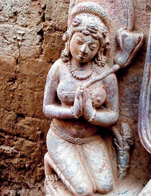 Among the over 15 stone sculptures found at the site are a red sandstone sculpture of Bodhisatva, Avlokiteshwar, Manjusri and the Buddha in his ‘earth witness’ mudra. A black stone statue of Buddha in abhay mudra (fearless mode) from the Pala period has been found. The red sandstone Bodhisatva sculpture is believed to be from the Gupta period. Some sculptures of Hindu deities such as Uma Maheshwar and Ganesh and Vishnu from the later Pala period were also found. The presence of a Yamantaka sculpture is evidence of Tantric Buddhism at the monastery.