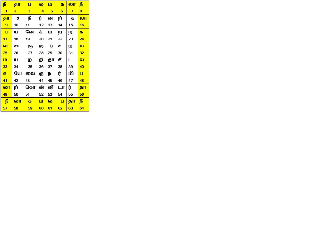 செய்யுளில் நான்கு பக்கங்களிலும் நீதா பலமகலா நீ என்ற நான்காம் அடி அமையப் பெற்றுள்ளது. (மஞ்சள் வண்ணத்தில் சுட்டிக் காட்டப்பட்டுள்ளது)