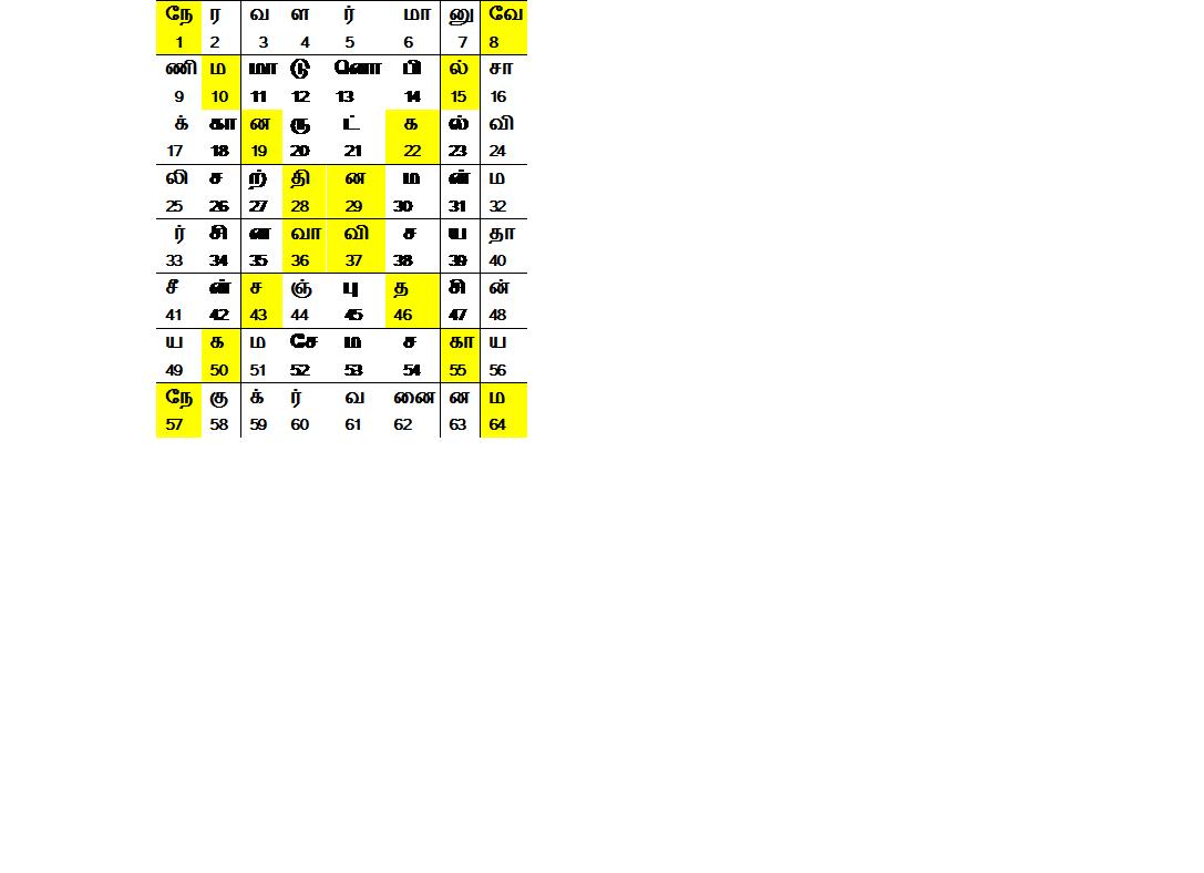 2) அதில் மேலே உள்ள படி ஒரே எழுத்துக்கள் குறிப்பிட்ட இடத்தில் வருமாறு அமைக்கப்படல் வேண்டும்..(துருவக் குறிப்பு என இந்த அமைப்பு தரப்பட்டிருக்கிறது.)