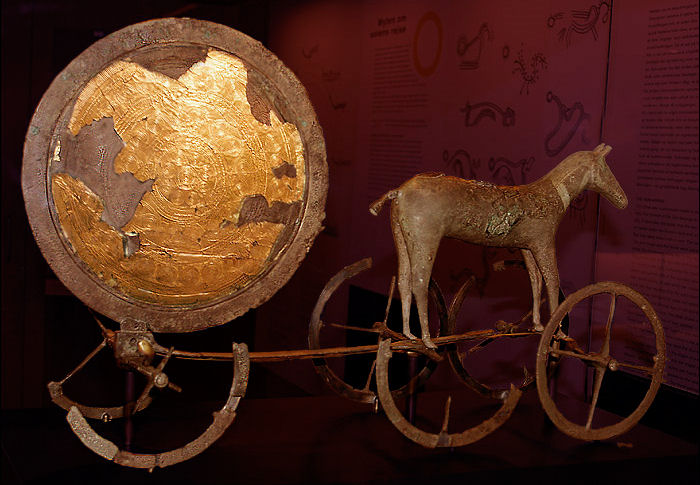 2.It is made up of bronze and covered on one side with gold. A horse is pulling a chariot of sun disc. It belongs to Nordic Bronze Age.