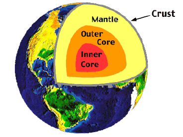 Earth’s inner core is a 2400 km wide ball of solid iron with some nickel and sulphur and radioactive elements. Outer core is 6800 kms wide ball of liquid iron nickel and sulphur. The mantle is 2900 km deep mixture of semi molten rock. The crust is only 8 to 40 kms thick and we live on this crust. The earth is a magnetic dynamo. It is magnetic field generator.