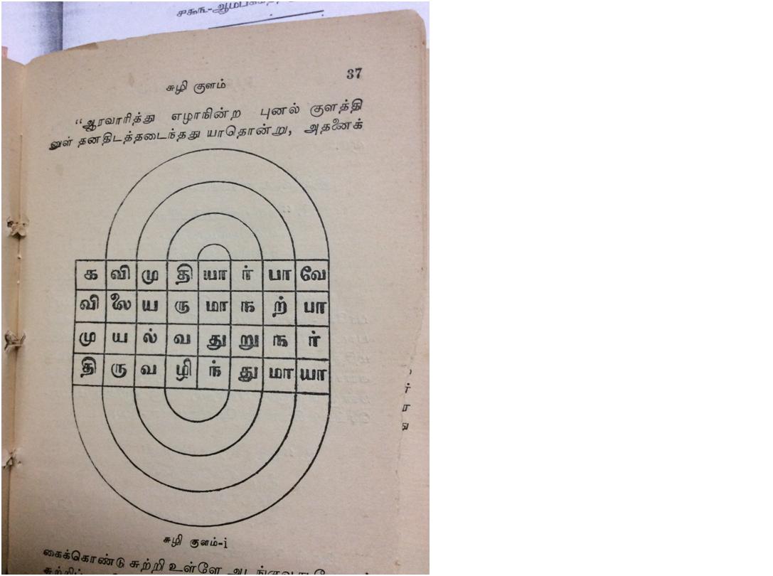 கிடைமட்டமாக செய்யுளின் நான்கு அடிகளும் வருவதை முதலில் காணலாம். பின்னர் எட்டு செங்குத்தான வரிசைகளில் மேலிருந்து கீழாக முதல் வரிசையிலும் அடுத்து கீழிருந்து மேலாக எட்டாம் வரிசையிலும் இப்படி மாறி மாறி 2,7,3,6,4,5 ஆகிய வரிசைகளில் செய்யுள் அமைவதைக் கண்டு இன்புறலாம்.