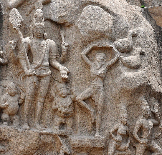 அர்ஜுனன் சிறந்த சிவ பக்தன். அர்ஜுனனின் வில்வித்தையைக் கண்டு மகிழ்வதற்காக வேடனாக வந்த சிவன் பன்றியின் பின் பக்கமாக அம்பு எய்ய அர்ஜுனன் அது செல்லாது என்கிறான். ஆனால் தர்ம சாஸ்திரப்படி அது செல்லும் என்று கூறிய சிவன் அர்ஜுனனைப் பலவிதமாக திக்குமுக்காடச் செய்து அவன் வில்வித்தையைக் கண்டு மகிழ்கிறார். ஒரு கட்டத்தில் வில்லைத் தூக்கி எறிந்த பார்த்தன் மல்யுத்தம் செய்ய முன்வர சிவன் மகிழ்ச்சியோடு அவனை எதிர் கொள்கிறார். யுத்தத்தின் ஒரு அங்கமாக சிவனின் காலை அர்ஜுனன் மடக்கிப் பிடிக்கவே தன் காலில் விழுந்த பக்தனுக்கு அனுக்கிரஹம் செய்வதையே கடமையாகக் கொண்ட சிவன் தன் சுய உருவத்தைக் காண்பித்து அவனை ஆசீர்வதிக்கிறார். பிரமித்து நிற்கும் அர்ஜுனன் தனது பெரும் பேறை எண்ணி மகிழ்கிறான். (இன்னொரு கூற்றின் படி வேடனைத் தாக்குப் பிடிக்க முடியாத நிலையில் அர்ஜுனன் சிவலிங்கத்தைத் தொழ கேட்டதை அனுக்ரஹிக்கும் சிவன் வேட உருவத்தை மாற்றி சிவனாக அவன் முன் தோன்றி ஆசீர்வதிக்கிறார்)