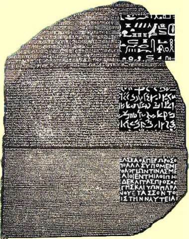 Rosetta Stone in Ancient Greek, Demotic and Hieroglyphs, displayed in British Museum,London.