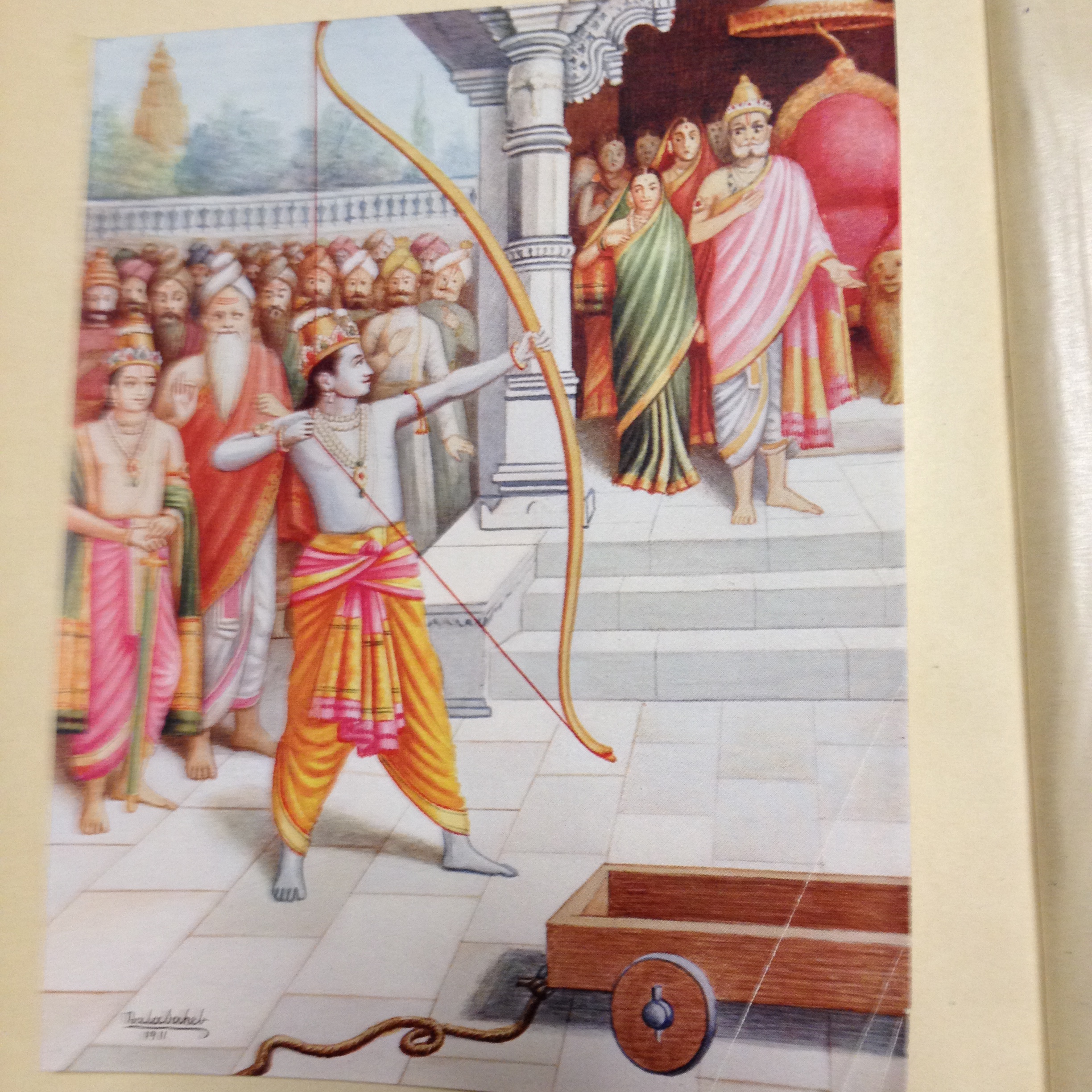 Viswamitra (meaning Friend of the World) told Janaka that Rama is ready to bend the Siva Danush. Janaka said,” I have promised to give Sita in marriage to him, who can bend and wield the bow. Rama may try this fortune, if he likes”. (Sita means ploughshare. She was found in the field. Rig Veda has hymns on Sita, but not Ramayana Sita) At the order of Viswamitra Rama drew the bow string so far that the bow string burst asunder in the presence of thousands of men and women. Kamban in Tamil Ramayana says, people only saw Rama taking the bow. The next minute they only heard the noise of breaking of the bow; his action was so swift!!!