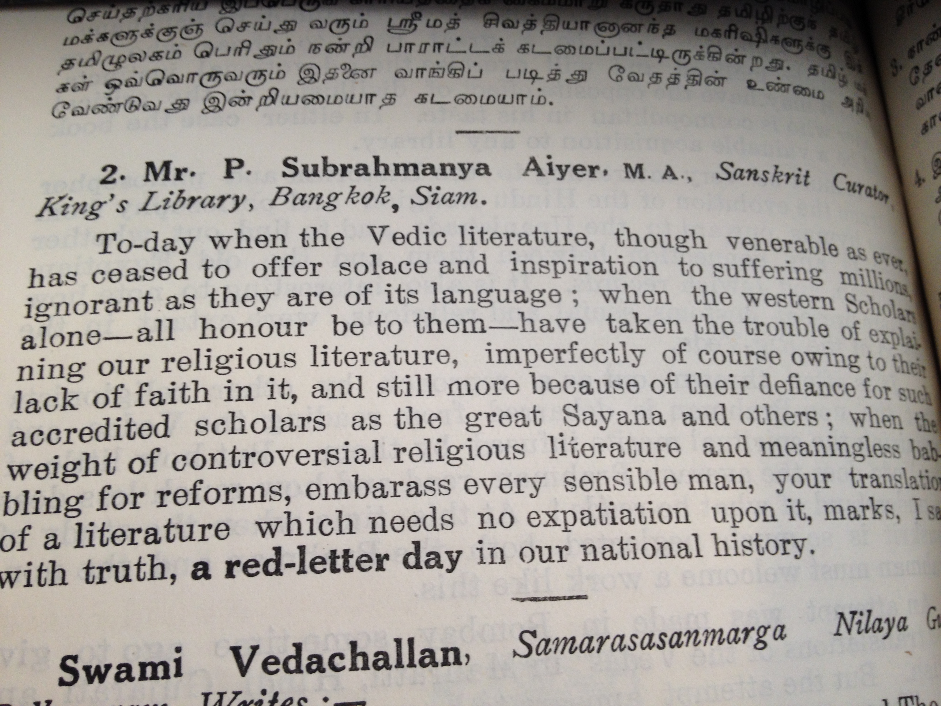 தமிழ்க் கவிதை வடிவிலான இந்த ரிக் வேத மொழிபெயர்ப்பு தமிழ் நூல் வெளியீட்டில் ஒரு மைல் கல் என்றே சொல்வேன். இது சென்னை கன்னிமரா நூல்நிலயம் போன்ற இடங்களில் கிடைத்தால் மறு பதிப்பு செய்ய வேண்டியது தமிழர்தம் கடமையாகும். அதுவே அவருக்கும் அவரை இப்பணியில் தூண்டியோருக்கும் நாம் செலுத்தும் நன்றியாகும்.