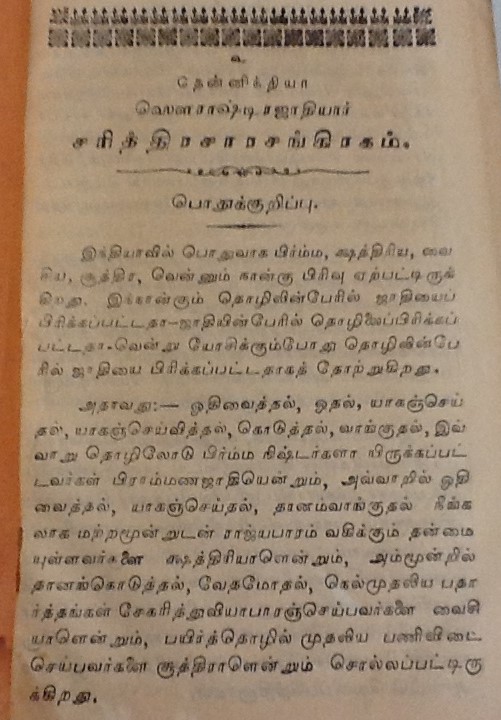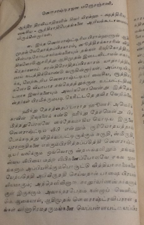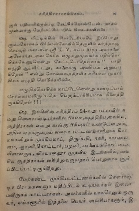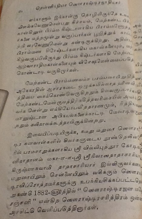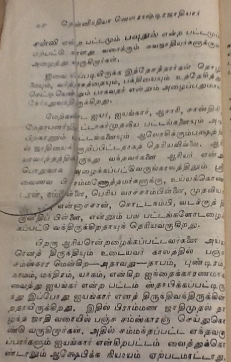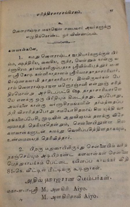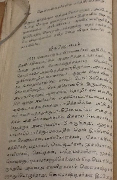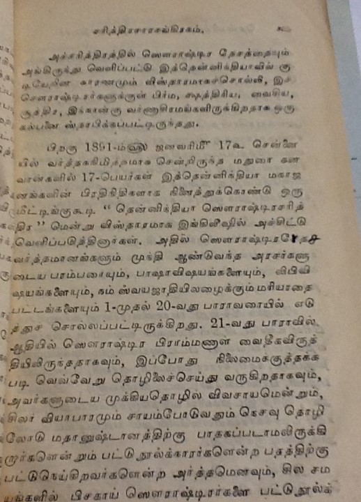 மதுரை, பரமக்குடி, சேலம் முதலிய பல ஊர்களில் வசிக்கும் சௌராஷ்ட்ரா சமூகத்தினர் குஜராத்திலுள்ள சௌராஷ்ட்ரா பிரதேசத்திலிருந்து வந்தனர். இவர்கள் பெரும்பாலும் பட்டு நூல், சேலை தயாரிக்கும் நெசவு வேலைகளில் ஈடுபட்டதாலும், அக்கலையில் கை தேர்ந்தவர்கள் என்பதாலும் இவர்களை பாமர ஜனக்கள் ‘பட்டுநூல் காரர்கள்’ என்று அழைப்பர். சுமார் 400 ஆண்டுகளுக்கு முன் இவர்களில் ஒரு பிரிவினர் பிராமணர்கள் என்று உரிமை கொண்டாடியவுடன் ஒரு விவகாரம் தலை எடுத்தது. அதை ஸ்ரீரங்கம் பட்டாசார்யார்கள், எப்படி தீர்த்துவைத்தனர் எனபனவெல்லாம் பிரிட்டிஷ் லைப்ரரியில் கிடைத்த கீழ்கண்ட பழைய புத்தகத்தில் உள்ளது. படித்து மகிழ்க.