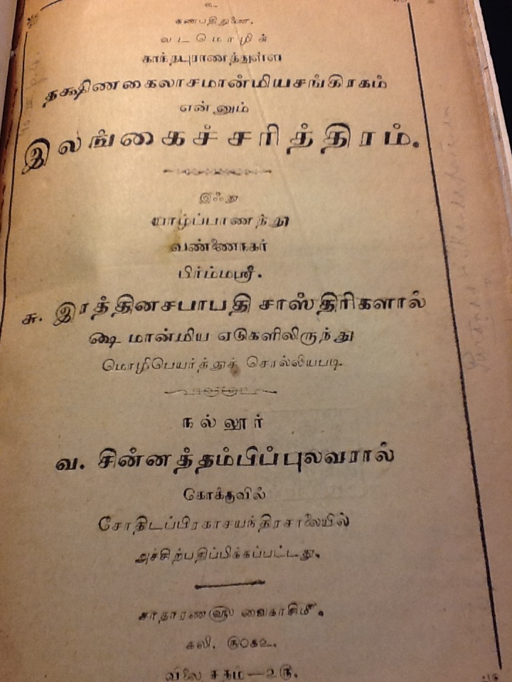 வடமொழியில் காந்தபுராணத்துள்ள, தக்ஷிண கைலாச மான்மிய சங்கிரகம் எனப்படும் இலங்கைச் சரித்திரம்