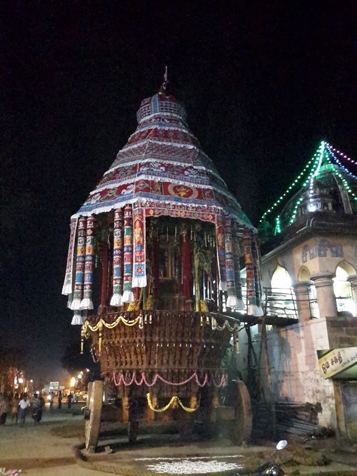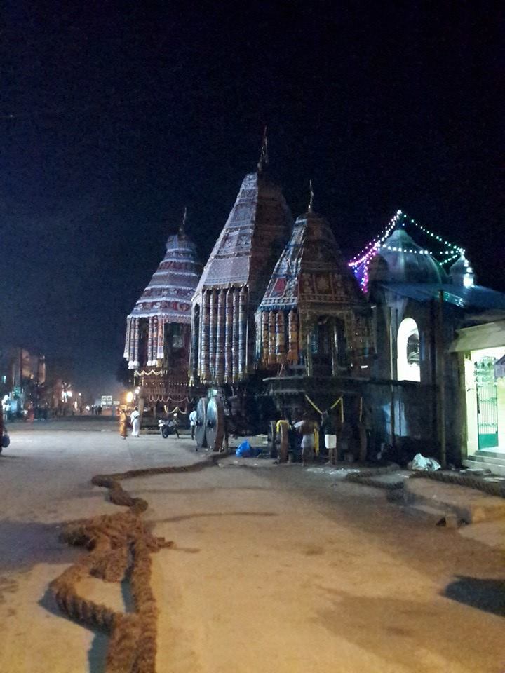 I was lucky enough to arrive at Chidambaram a few days before the festival, and the cars stood in a line before the eastern gopuram, bared of their huge caps of thatch and ready to be decorated. They were, if I mistake not, five in number, enough to accommodate all the Siva’s household and over. The chariot of the paternal deity was new, and the height of the wooden hull alone must have been nearly twenty feet the car was, as usual octagonal in shape, and over hung; and though inferior to some of the older cars in design and ornament, it was by no means unworthy to be placed among them.