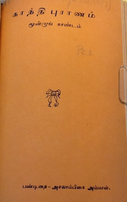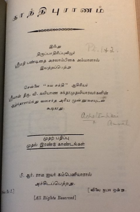 1910, 1920 ஆம் ஆண்டுகளில் பல ஆன்மீக நூல்களையும், சொற்பொழிவுகளையும் செய்தவர் திருமதி பண்டிதை அசலாம்பிகை. அவரைப் புகழ்ந்து திரு.வி.க. போன்ற தமிழ் அறிஞர்களும் சித்தாந்த தீபிகை போன்ற பத்திரிக்கைகளும் எழுதியிருப்பதிலிருந்தே அவர் புகழ் குன்றின் மேலிட்ட விளக்கு போலப் பிரகாசிக்கிறது. அவர் காந்தி புராணம் என்று காந்தியின் வாழ்க்கை வரலாற்றை கவிதை வடிவில் எழுதி மூன்று பகுதிகளாக நூல்களாக வெளியிட்டுள்ளார். நல்ல கவி உள்ளம் படைத்தவர் என்று தெரிகிறது. முதல் முன்று பகுதிகள் காந்தியின் 1924 ஆம் ஆண்டுவரையுள்ள வாழ்க்கைச் சம்பவங்களை விவரிக்கிறது. அதற்குப் பின்னுள்ள காந்தியின் வரலாற்றை இவர் எழுதினாரா என்று தெரியவில்லை (பிரிட்டிஷ் லைப்ரரியிலுள்ள புத்தகங்களை அடிப்படையாக வைத்து இதை எழுதுகிறேன்).