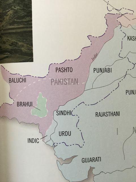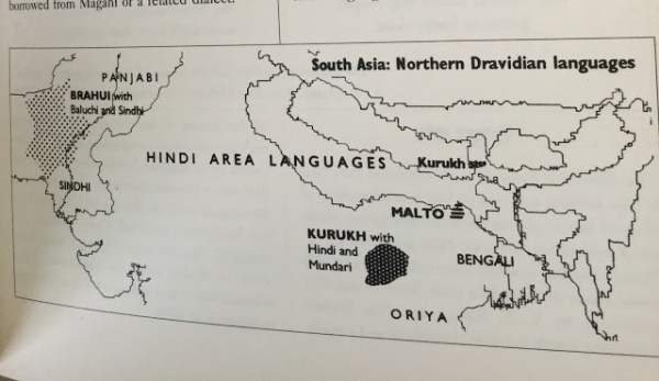 “Brahui, major language of western Pakistan, is an astonishing survival – utterly different from the Iranian languages that surround it. Most Brahui speakers are bilingual in Baluchi. There is no doubt that that Brahui belongs to the family of Dravidian languages of South India, though it is separated from the nearest of them by many hundreds of miles (see map at KURUKH).