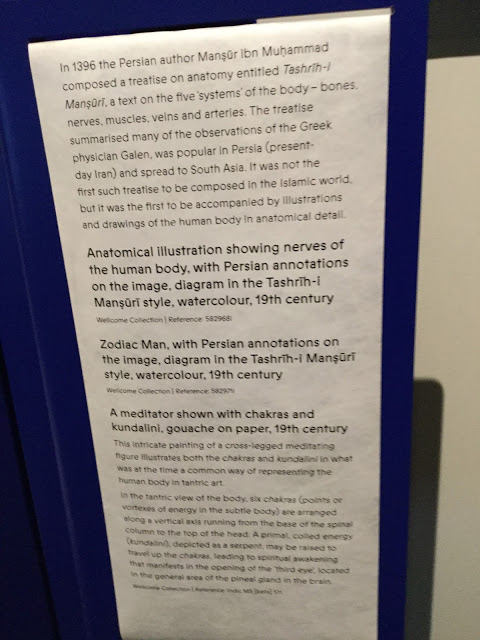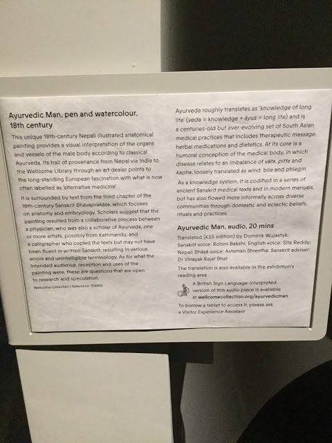 This is the painting that gave the title to the current exhibition running until 8th April. This is a pen and water colour painting from Nepal showing all the body organs and vessels of the male body. The painting is from 18th century; but is surrounded by texts in Sanskrit, which are taken from the 16th century work Bhavaprakasa. It focuses on anatomy and embryology. The mistakes in Sanskrit show that the calligrapher was not familiar with Sanskrit. It is drawn according to Ayurveda- the ancient Indian medical system. Ayur Veda means Knowledge of Long Life.