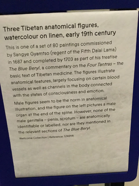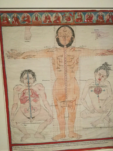 There are water colour paintings on linen. 80 paintings were commissioned by the regent of the Fifth Dalai Lama and they were completed in 1703. He go them for his book Blue Beryl which was a commentary on the four Tantras- the basis of Tibetan medicine. Blood vessesls are shown in the pictures.