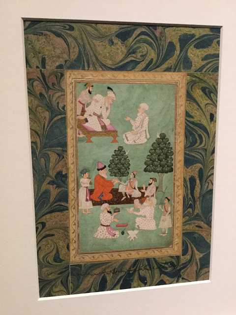 “This painting depicts an episode from a romance set in the Moghul court. Emperor Aurangzeb , a Hakim (Unani physician) is at his shoulder with his chief minister. He is worried about his son (in red),who is lovesick for Mallikeh Mulk, a fair princess. The hakim on the lower left recommends an ointment.