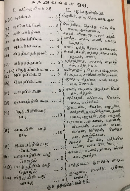 1915 ஆம் ஆண்டில் வெளியான தாயுமான சுவாமி பாடல் புத்தகத்தில் 96 தத்துவங்களின் பட்டியல் உளது; அதைக் கீழே காண்க:-