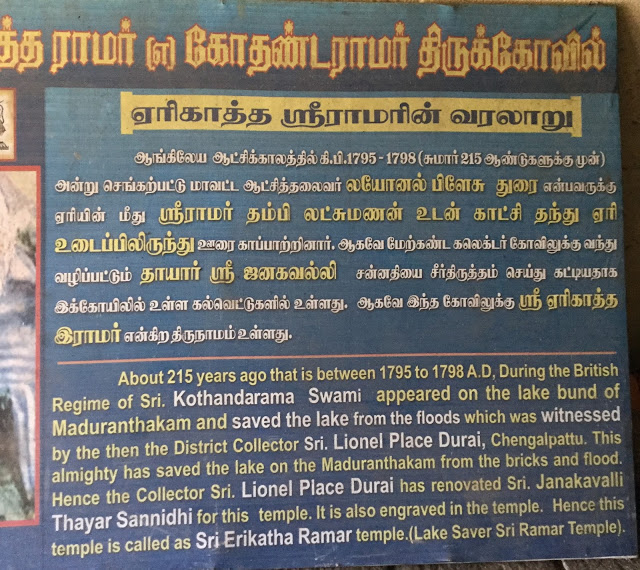 When he saw big granite pillars in the famous ancient Rama temple he told that it could be used for strengthening the banks of the lake. The priests objected to the proposal saying that Rama would protect the town. But the collector insisted that if God could protect the lake why it breached several times. But he wanted to wait and see what happens in the next few days’ rain. The lake was full to the brim. Worried collector was supervising the banks at the dead of night. Suddenly he saw a flash of light and there stood two people with bow and arrow walking on the banks of the lake. The rain also stopped and nothing untoward happened. The collector knew that it was Lord Rama and his brother Lakshmana who were guarding the lake. He had seen those pictures in the local temple. Collector Place’s name is in the inscription in the temple and the temple was renamed as Eri Kaatha Ramar in Tamil meaning ‘Rama who protected the Lake’– temple. It is on record that Col. Place along with Robert Clive had donated jewellery to the temples in that area including Kancheepuram.