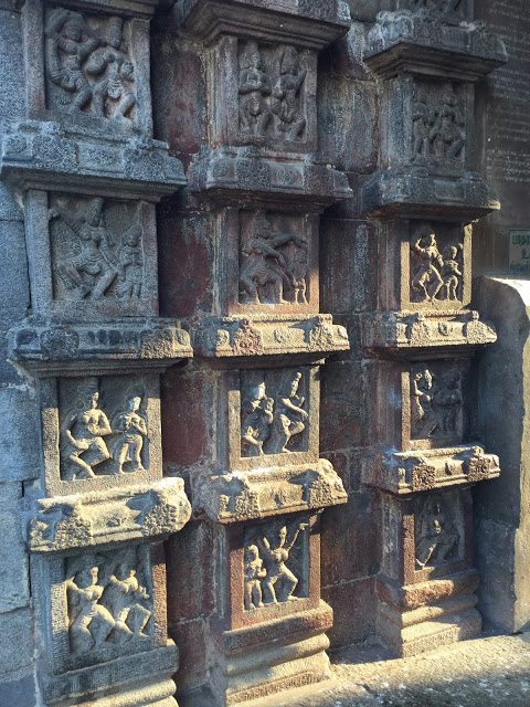 பிரம்மாண்டமான வாசல் அருகில் சுவர் முழுதும் கட்டம் கட்டமாக சிற்பங்கள். அதுபோல தோரண வாயில் நங்கைகள் முதலியன.
