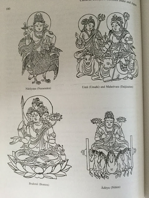 There were 131 shrines to Sarasvati. The German text deserved to be translated into English to get vivid picture of vibrant Buddhism in Edo. In 1836 a shrine to Varuna was consecrated to prevent typhoons. The Japanese worshipped Indra for long life, Brahma to succeed in Imperial service, Varuna for rain, Garuda to cure poisoning and Mahaa  kaala (Good Time) for good business and for victory in war. Japan has the oldest functioning temple of Ganapati in the world.