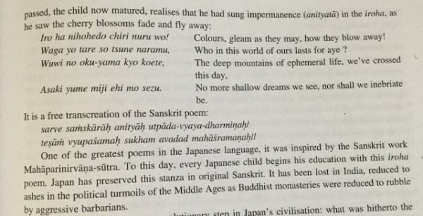 One of the greatest poems in Japanese language, it was inspired by the Sanskrit work, Mahapari nirvana Sutra. To this day every Japanese child begins his education with this IROHA poem. Japan has preserved this stanza in original Sanskrit. It has been lost in India.