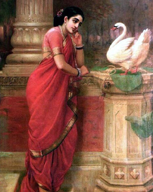 நளன் அன்னம் வாயிலாக தமயந்தியின் அழகு வர்ணனையைக் கேட்கிறான்.