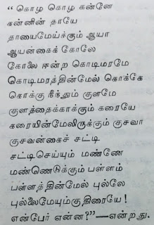 இன்று pre-school, நர்சரி என்று எல்லாம் ஆங்கிலமய மாகிவிட்டதால், குழந்தைகளுக்கு இத்தகைய பாடல்கள் தெரியாது. ஆங்கில Nursery rhymes தான். அதிலும் சில விபரீத அர்த்தமுள்ளவையாம். யாரும் கண்டுகொள்வதில்லை. சொன்னாலும் கேட்கமாட்டார்கள். தமிழில் சிந்திக்கத் தெரியாது என்பதோடு, ஆங்கிலத்திலும் சுயமான சிந்தனை வளம் இல்லை. School ,college education is based on rote learning and repeating standard expressions and ready-marked answers.
