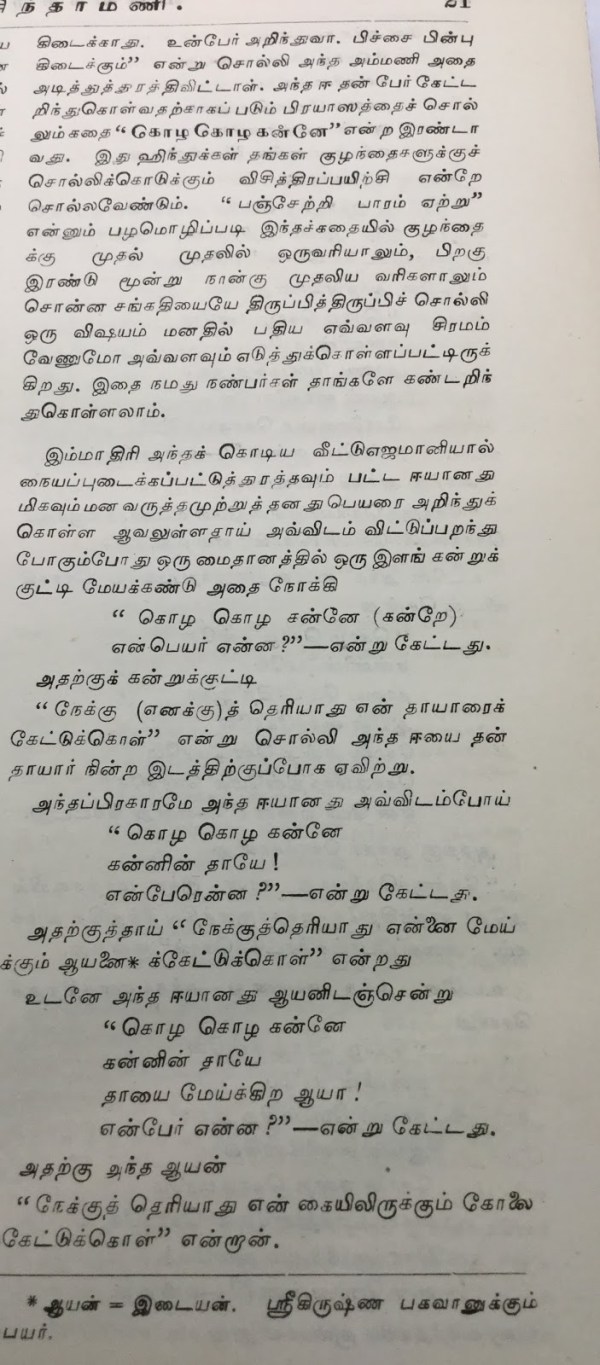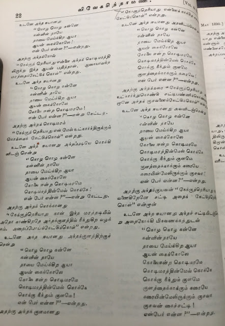 நாங்கள் சிறு குழந்தைகளாக இருந்தபோது (65 ஆண்டுக்கு முன்னால்) என்னுடைய தாயார் எங்களுக்கு ‘கொழ கொழ கண்ணே’ கதையைச் சொல்லுவார்கள். அதை ஒவ்வொரு நாள் இரவிலும் சொல்லச் சொல்லிக் கேட்போம். இது தஞ்சைப் பகுதியில் மட்டும் வழங்கியதா அல்லது மற்ற பகுதிகளிலும் வழங்கியதா என்று தெரியவில்லை. ஆனால் மாவட்டம் தோறும் பல குழந்தைகள் பாடல்கள் வழங்கியதை அறிகிறோம். 1899ம் ஆண்டு வெளியான விவேக சிந்தாமணி என்ற சென்னை மாத இதழைப் பார்த்தவுடன் மஹா சந்தோஷம்.அதில் இன்று படித்த, முன்னொரு காலத்திலென் தாயார் சொன்ன குழந்தைப் பாட்டு இதோ.