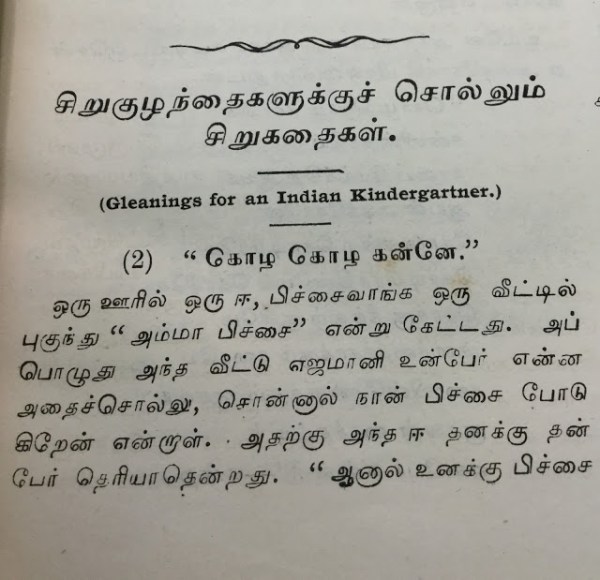 ‘என் பெயர் ஈ, இது தெரியாதா’? என்று முடிவடையும் தமிழ் நர்ஸரி ரைம்.