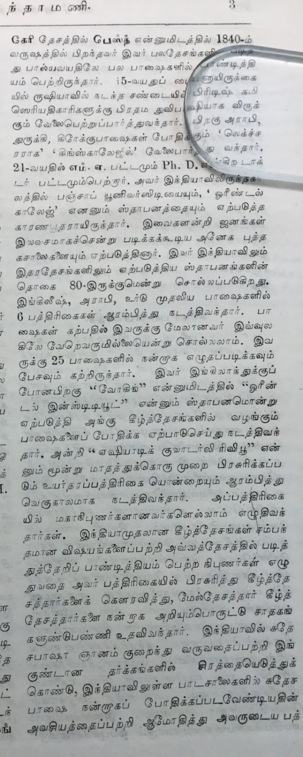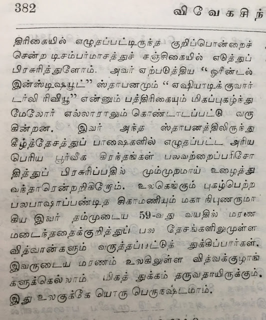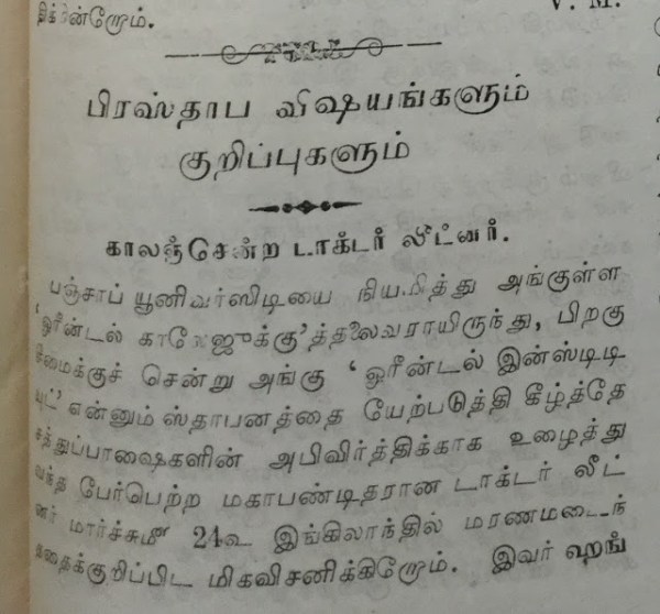 1899ஆம் ஆண்டு மொழியியல் அறிஞர் டாக்டர் லீட்னர் இறந்தவுடன் விவேக சிந்தாமணியில்