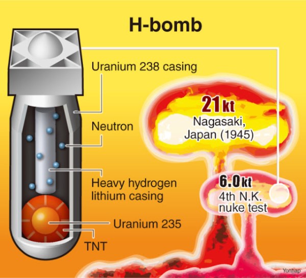 The hydrogen of the hydrogen bombs is the compound of lithium hydride, in which the lithium is in the form of enriched lithium -6 isotope and the hydrogen is the hydrogen -2 isotope, also known as deuterium. This lithium deteuride is capable of releasing massive energy by nuclear fusion. This is achieved by placing it round the core of an atom bomb, which provides the heat necessary to initiate a nuclear fusion reaction as well as providing the nuclear flux. When the bomb detonates , it releases neutrons from the fission of its uranium -235 and these are absorbed by the nuclei of lithium 6 which immediately disintegrates to form helium and hydrogen 3. The hydrogen 3 then fuses with the deuterium to form more helium and this releases more yet more neutrons.  These are absorbed by the casing of the bomb, which is made up of uranium 238 and they convert it to plutonium 239 which then adds a third explosion, again one of nuclear fission.