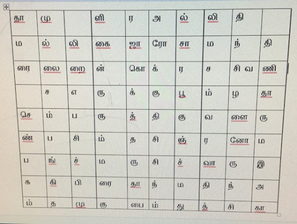 | ம | ல் | லி | கை | ஜா | ரோ | சா | ம | ந் | தி |