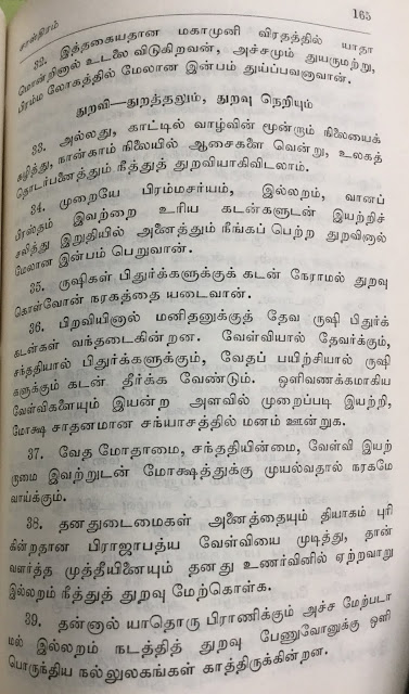 கல்யாணம் செய்யாமல், குழந்தை பெறாமல், திடீர் சந்யாசி ஆவதும் பாபம் என்பார் மநு (ஸ்லோகம் 37).புறநானூற்றிலும் சாகும்வரை உண்ணாவிரதம் இருந்த குழுவில் சேர வந்த ஒரு புலவரை பிள்ளை பெற்ற பின்னர் வா என்று திருப்பி அனுப்பி விடுகின்றனர். ஆனால் பிசிரந்தையார் போன்ற வயதானவர்களை வரவேற்று ஏற்றுக் கொள்கின்றனர்.