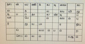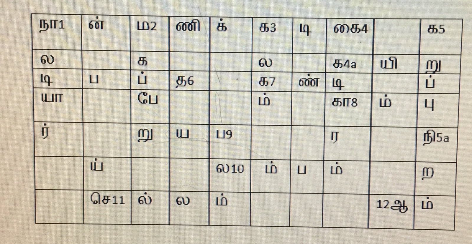 | நா1 | ன் | ம2 | ணி | க் | க3 | டி | கை4 | க5 | |