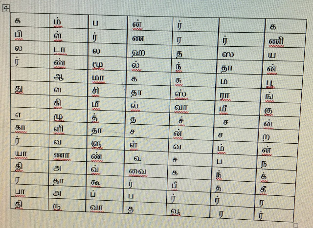 கட்டத்திலுள்ள 15+++ சொற்களைக் கண்டு பிடியுங்கள். இதோ உதவும்குறிப்புகள்; முயன்று பாருங்கள்; முடியாவிட்டால் விடை கீழேதரப்பட்டுள்ளது. அதைக் கண்டு மகிழுங்கள்.