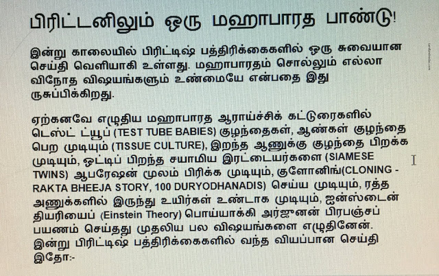 (மஹா    பாரதத்திலுள்ள டெஸ்ட் ட்யூப் TEST TUBE BABY குழந்தை, செக்ஸ் மாற்ற ஆபரேஷன் SEX CHANGE OPERATION, ஒட்டிப் பிறந்த இரட்டைக் குழந்தை (SIAMESE TWINS சயாமீஸ் ட்வின்ஸ்) முதலிய பத்து ரஹசியங்களை பழைய கட்டுரைகளில் காண்க)