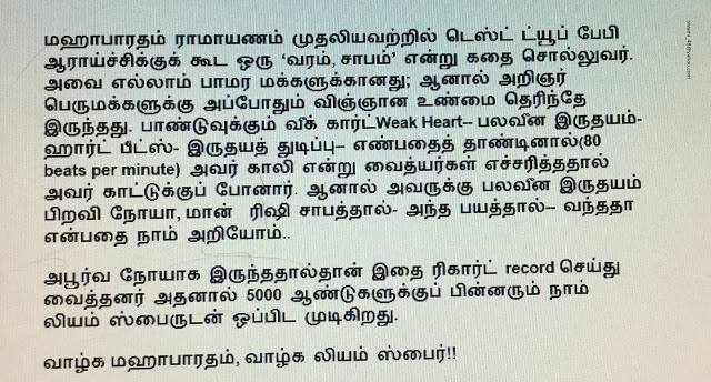 மஹாபாரதத்தில் பலருடைய விசித்திரமான பிறப்புகளின் பின்னுள்ள உண்மைகளை — அறிவியல் உண்மைகளை — நிறைய எழுதிவிட்டேன். இன்று பாண்டு, திருத ராஷ்டிரன் பிறப்புகளில் உள்ள விஞ்ஞான உண்மைகளைத் தொட்டுக் காட்டுகிறேன்.