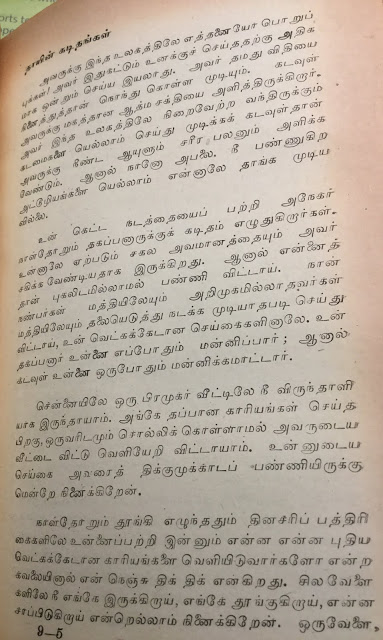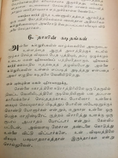 ஒரு தாயின் உருக்கமான கடிதத்தை ஒவ்வொருவரும் படிக்க வேண்டும். பிற்காலத்தில் காந்திஜியிடம் அவரது மகன்களின் தீய வாழ்க்கை பற்றிக் கேட்ட போது நான் பூர்வ ஜன்மத்தில் செய்த பாவத்தை மூட்டை கட்டிக்கொண்டு வந்துவிட்டேன் என்றார்.