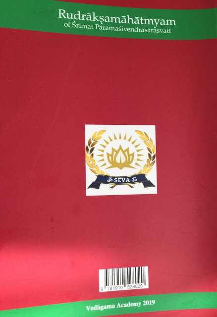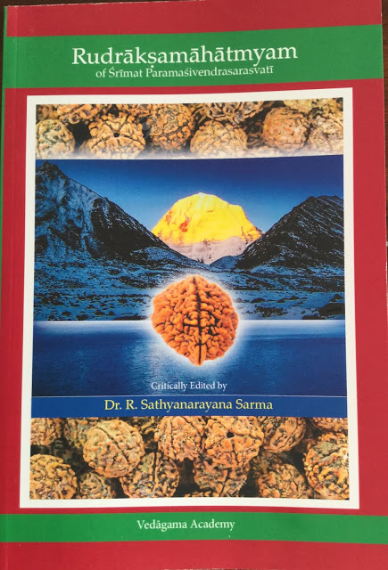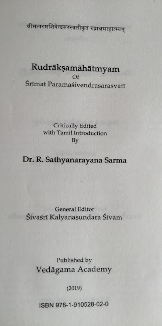 முதலில் நூல் வெளியீட்டு விழா பற்றிக் காண்போம். டாக்டர் ஆர்.சத்ய நாராயணன், பாண்டிச்சேரியிலுள்ள கீழ்திசை ஆராய்ச்சி நிலையத்தில் ஸம்ஸ்க்ருத ஆராய்ச்சித் துறைக்குப் பொறுப்பு வகிக்கிறார். அவர் பிரெஞ்சு ஆளுகைக்குட்பட்ட பல தென் கிழக்காசிய நாடுகளுக்கும் ஐரோப்பிய நாடுகளுக்கும் சென்று வந்தவர். பல நூல்க ளை  இயற்றியுள்ளார். ஜூலை 21, 2019ல் லண்டனில் அவர் எழுதிய “ருத்ராக்ஷ மாஹாத்ம்யம்” வெளியிடப்பட்டது. இந்த நூல் பரமசிவேந்திர சரஸ்வதி அவர்களால் சில நூற்றாண்டுகளுக்கு முன்னர் எழுதப்பட்டது. அதை தமிழ் முன்னுரையுடன் கிரந்தத்திலும் தேவ நாகரி லிபியிலும் அப்படியே வெளிட்டுள்ளனர். பல சுவடிகளில் பல பிழைகள் இருப்பதால அவைகளை நீக்கி ஆராய்ச்சிப் பதிப்பாக வெளியிட்டுள்ளார் டாக்டர் சத்யநாராயண சர்மா. இது ஏற்கனவே 10 நூல்களை வெளியிட்ட லண்டன் வேதாகம அகாடமியின் பதிப்பாக வந்துள்ளது. சிவ ஸ்ரீ கல்யாண சுந்தர சிவம், நூலின் ஜெனரல் எடிட்டர் (General Editor).