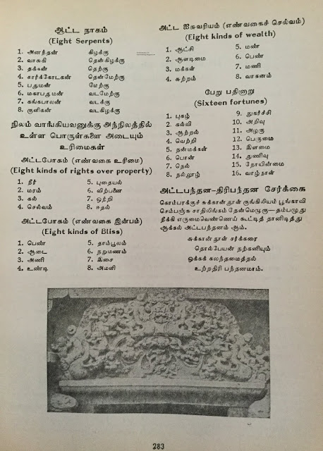 96 பிரபந்தம், 32 அறம், 64 கலை, 11 ஆடல், 10 ஆயுதம் பட்டியல், அட்டநாகம், அட்ட போகம், அட்டபந்தனம் (அஷ்ட பந்தனம்), 16 வகைப் படைகள், பத்து விரல்கள், பல வகை மணிகள் ஆகியவை இதில் உள்ளன