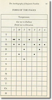 அமெரிக்காவின் சிறந்த சிந்தனையாளரும், விஞ்ஞானியும், அமெரிக்காவை உருவாக்கியவர்களில் ஒருவருமான (Founding father) பெஞ்சமின் ஃபிராங்ளின் நேரத்தைப் பொன் போல மதித்தவர். அவர் தனக்கென ஒரு உத்தியை உருவாக்கிக்கொண்டார். இதை பெஞ்சமின் ஃப்ராங்க்ளினின் 13 பண்புகள் திட்டம் (Franklin’s 13 Virtues System) என்று சொல்லலாம்.