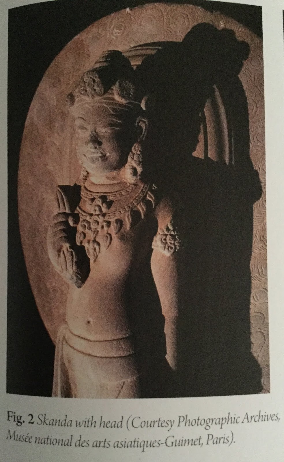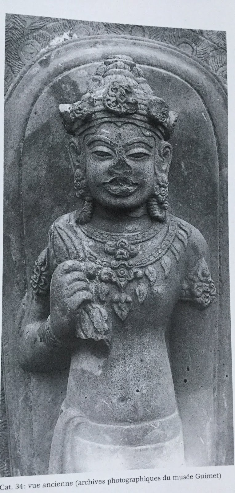 The vajra he holds in hiss right hand and the five chignons also assist in identifying him. Skanda in his young appearance as Kumara wears several pieces of jewellery. The head sadly lost in about 1988 once bore particular earrings, mixing flower motifs and pendants with pears inserted into elongate lobes.
