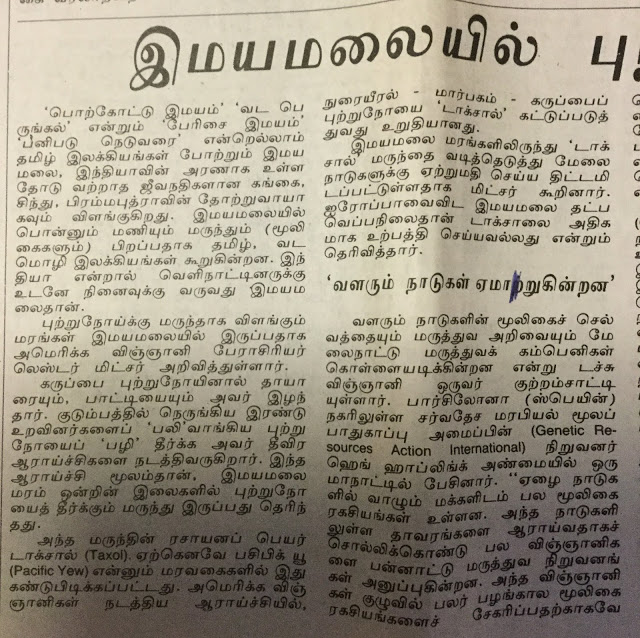 நான் எழுதிய ‘இமயமலையில் புற்றுநோய்க்கு மருந்து’ என்ற கட்டுரை தினமணியில் உலகப் பலகணி -யின் கீழ் 1992-ம் ஆண்டு ஜூன் 14ம் தேதி வெளியானது. அத்துடன் ரஷியாவை அதிரவைத்த கொலை வழக்குகள், பாட்டில் படத்தின் விலை 21 லட்சம் டாலர் என்ற கட்டுரைகளும் வெளியாகின. முதலில் இமயமலையில் புற்று நோய்க்கு மருந்து என்பதைக் காண்போம்.