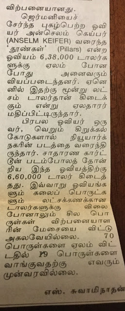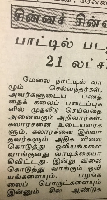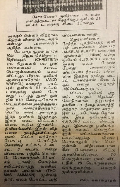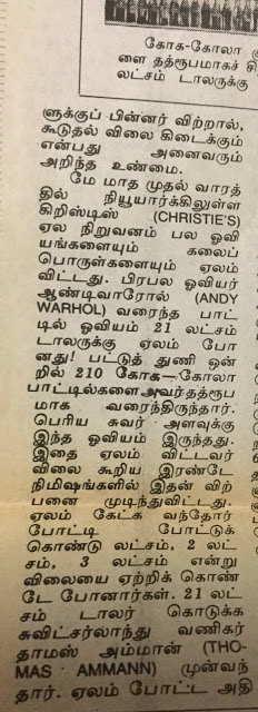 நான் எழுதிய `பாட்டில் படத்தின் விலை 21 லட்சம் டாலர்` என்ற கட்டுரை தினமணியில் உலகப் பலகணி -யின் கீழ் 1992-ம் ஆண்டு ஜூன் 14ம் தேதி வெளியானது. அத்துடன்  , `ரஷியாவை அதிரவைத்த கொலை வழக்குகள்’ இமயமலையில் புற்று நோய்க்கு மருந்து` என்ற கட்டுரைகளும் வெளியாகின. அவைகளை நேற்று வெளியிட்டேன். இன்று பாட்டில் பட ஏலக் கதை:–