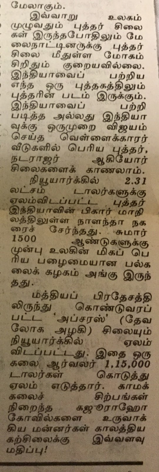 அந்தக் காலத்தில் ஏலச் செய்திகளைப் படிக்கும்போது, அட! இந்தியாவுக்கு இவ்வளவு மதிப்பா என்று எல்லோரும் நினைத்துப் புளகாங்கிதம் அடைந்தனர். இப்போதுதான் புரிகிறது; பல்லாயிரக் கணக்கான சிலைகளை விலைக்கு வாங்கி மியூஸியங்களில் வைத்து நம்மை விட அவர்கள் கூடுதலாக சம்பாதிக்கிறார்கள் என்பது. அது மட்டுமல்ல, நம் கோவில்கள் அனைத்தையும் மொட்டை அடித்துவிட்டு அங்கே போலி விக்ரகங்களை வைத்துவிட்டனர். இதற்குத் துணை போனவர்கள் நம்மவர்களே என்பதை நினைக்கையில் வருத்தமாகவும் இருக்கிறது.