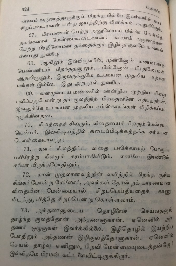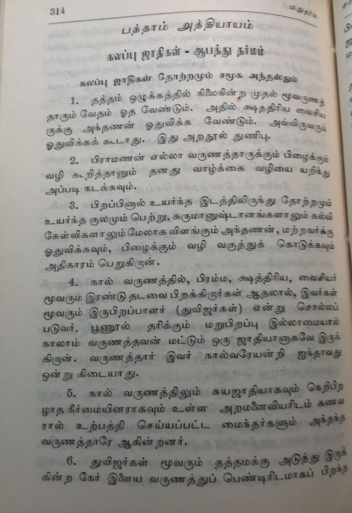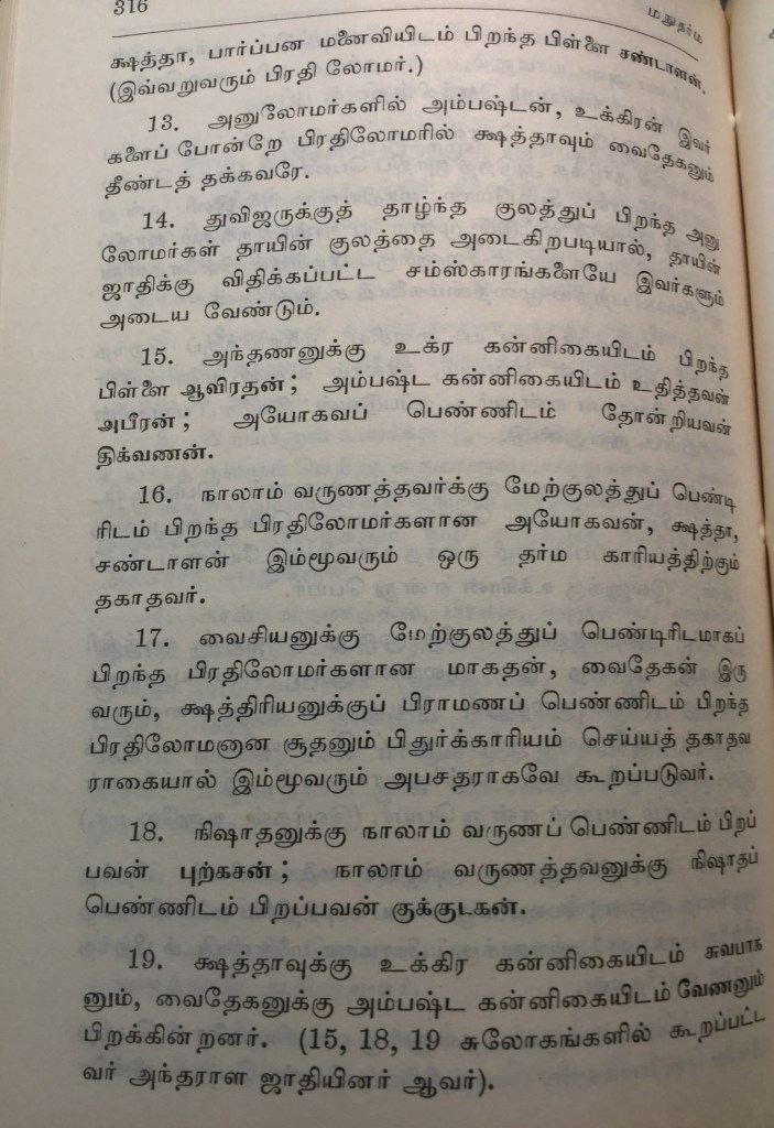 சுலோகம் 20, 22 –திராவிடர், விராத்யர் பற்றிப் பேசுகிறது. தமிழ்ச் சங்கத்தில் நக்கீரர் முதலிய பிராமணர்கள் விராத்தியர் எனப்படுவர். அவர் சங்கு அறுத்து வளையல் செய்யும் தொழிலில் இருந்தார்.