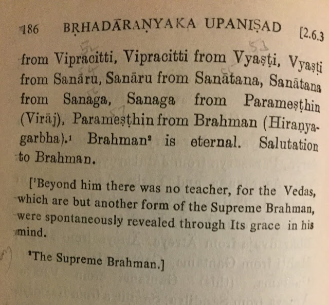 Brihad Aranyaka Upanishad is the oldest of the 108 Upanishads. Even the jaundice eyed foreigners generously dated it as 850 BCE material. But Hindus believe it is still older which is proved by the internal evidence. This Big Forest (Brihad Aranyaka) Upanishad has a chapter called Vamsa Brahmana in which it gives 57 generations of teachers and two gods.