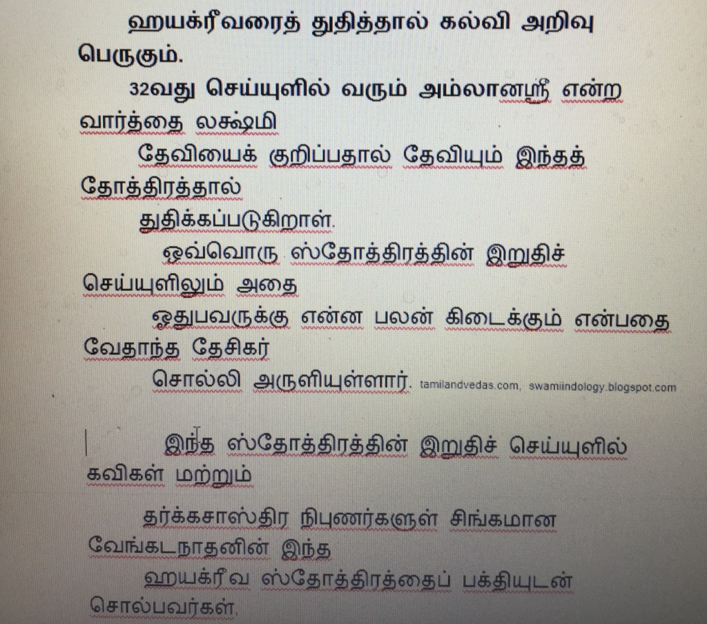 இறுதி ஸ்லோகத்தில் தேசிகர் இந்த ஸ்லோகங்களைப் படித்தவர்கள் தன்னை சரணம் அடைந்தவர்களுக்கு தன் கரங்களை இரட்டிப்பாக்கிய விஷ்ணு அருள்வார் என்று கூறியருள்கிறார்.