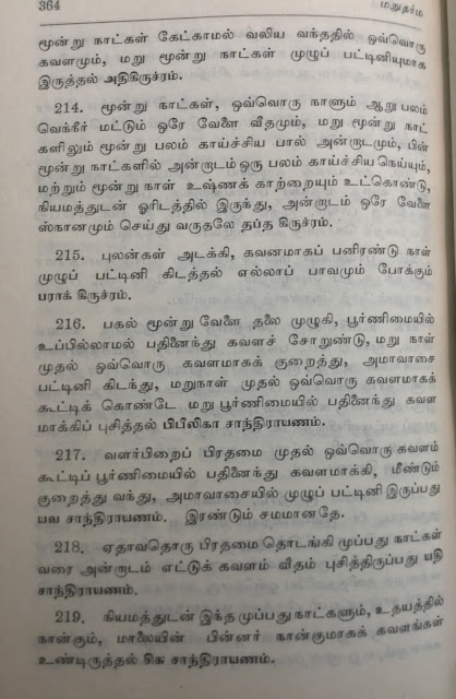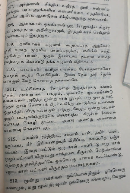 - 3. உண்ணாவிரதம் — இதுதான் எல்லோரும் எளிதில் பின்பற்றக்கூடியது. இதிலும் கூட எத்தனை நாள் எத்தனை கவளம் உண்ணலாம் என்றெல்லாம் மநு பகிர்கிறார். ஒரே நாளில் ஆறுமுறை குளிக்க வேண்டும் என்று கூட சொல்கிறார் .